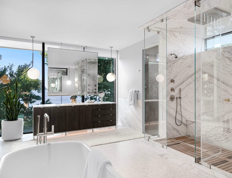 Modern Amenities: Includes an infinity-edge pool, outdoor kitchen, rooftop deck with hot tub, and a 55,000-pound boat lift.