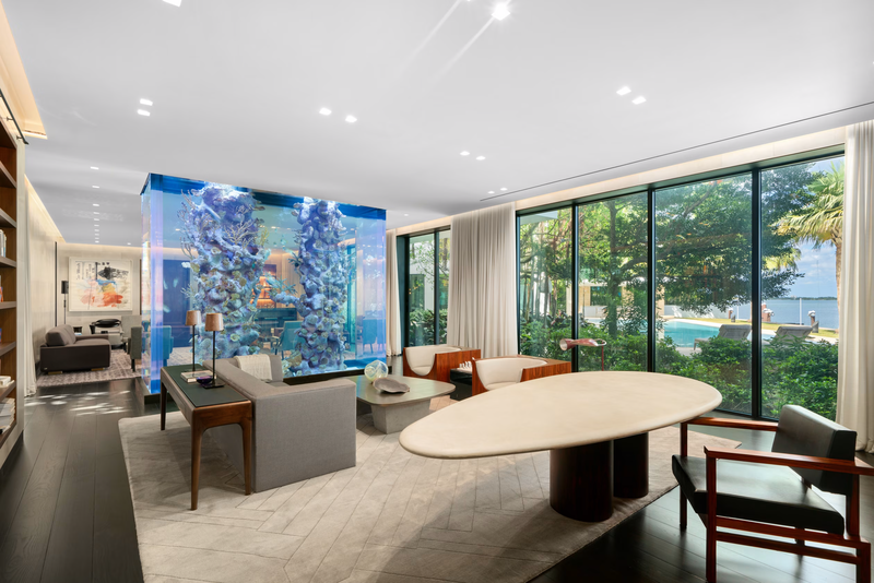 Luxury Features: The property boasts a 5,600-gallon aquarium, infinity-edge pool, and rooftop hot tub.